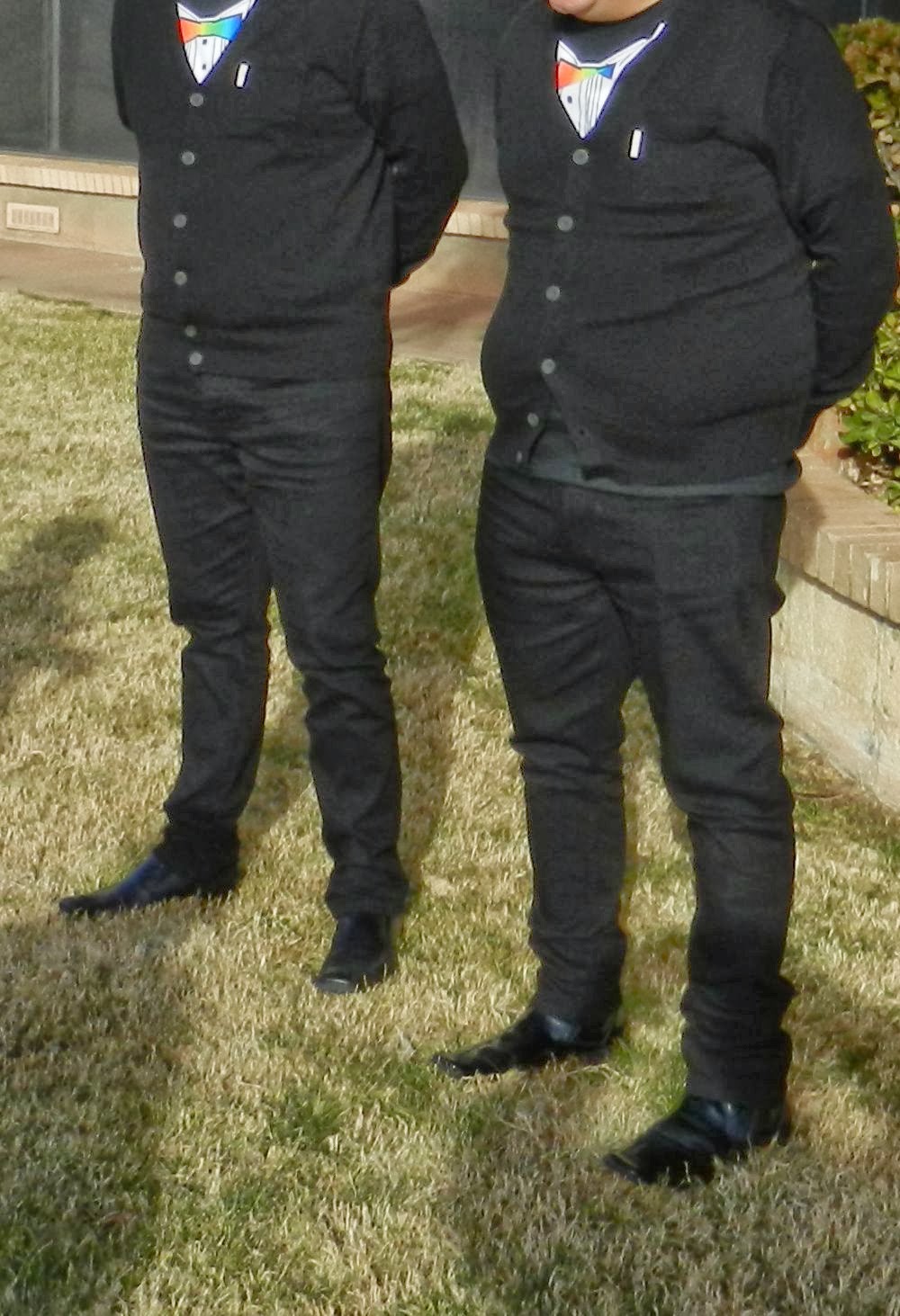 Jonah had picked out our outfits which consisted of custom-made tuxedo tee shirts with rainbow bow ties and metallic red roses: